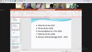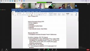 Rapat kerja pimpinan (rakepim) merupakan salah satu kegiatan ruitn yang diikuti oleh LPM setiap tahunnya. Kegiatan ini dilaksanakan untuk menyampaikan perjanjian kinerja tahun 2021 dan rencana aksi kegiatannya serta mendengarkan arahan dari pimpinan. Kegiatan ini diikuti oleh ketua LPM (Dr. Linda YArni., S.Ag., M.Si.), Kepala pusat audit dan pengendalian (Fajriyani., MA), Kepala pusat pengembangan standar (Hayati., MA), dan Pranata Komputer (Hj. Nurleli., M.Kom). RAKERPIM ke VII ini dilaksanakan melalui ZOOM meeting sejak hari senin-selasa tanggal 15-16 februari 2021 jam 07.30-16.00 yang  dibuka secara resmi oleh rektor IAIN Bukittinggi (Dr. Ridha Ahida., M.Hum). Pada hari pertama, materi disampaikan oleh rektor, wakil rektor 1 ( Dr. H. Asyari., S.Ag., M.Si), wakil rektor 2 (Dr, Novi Hendri., M.Ag.,) wakil rektor 3 (Dr. Miswardi., S.H., M.Hum), serta penyampaian perjanjian kinerja (perkin) dan rencana aksi tahun 2021 oleh dekan fakultas Syariah (Dr. H. Ismail., M.Ag., ), dekan fakultas tarbiyah dan ilmu keguruan ( Dr. Zulfani Semiarni., M.Pd.)., Dekan fakultas Ekonomi dan Bisnis Islam (Dr. IIZ Izmudin., MA), dekan fakultas ushuluddin, adab dan dakwah (Dr. Nunu Burhanuddin., Lc., MA). Pada hari kedua, penyampaikan perjanjikan kinerja (perkin) dan rencana aksi tahun 2021 dilanjutkan oleh direktur pascasarjana (Dr. Ghazali., M.Ag), ketua LP2M (Dr. Afrinaldi., S.Sos.I., MA), Ketua LPM (Dr. Linda YArni., S.Ag., M.Si.), ketua UPT Laboratorium terpadu (Syahrul., SS., M.Pd.), Kepala UPT perpustakaan (Novi Zulfikar., S.Sos., M.Ap,) kepala Ma’had Al-Jamiah (Tomy Hendra, S.Sos., MA), Pengelola rumah jurnal (Firdaus Anas., S.Pd., M.Kom)., Kepala unit tekhnologi dan pangkalan data (Tomy Arswendo., S.Kom), Pengelola unit bisnis( Ilham Ilahi., M.Sc.), Kepala Bagian Umum (H. Idrial., S.Pd)., dan kepala SPI (Zulhelmi., SE., M.Si.)
