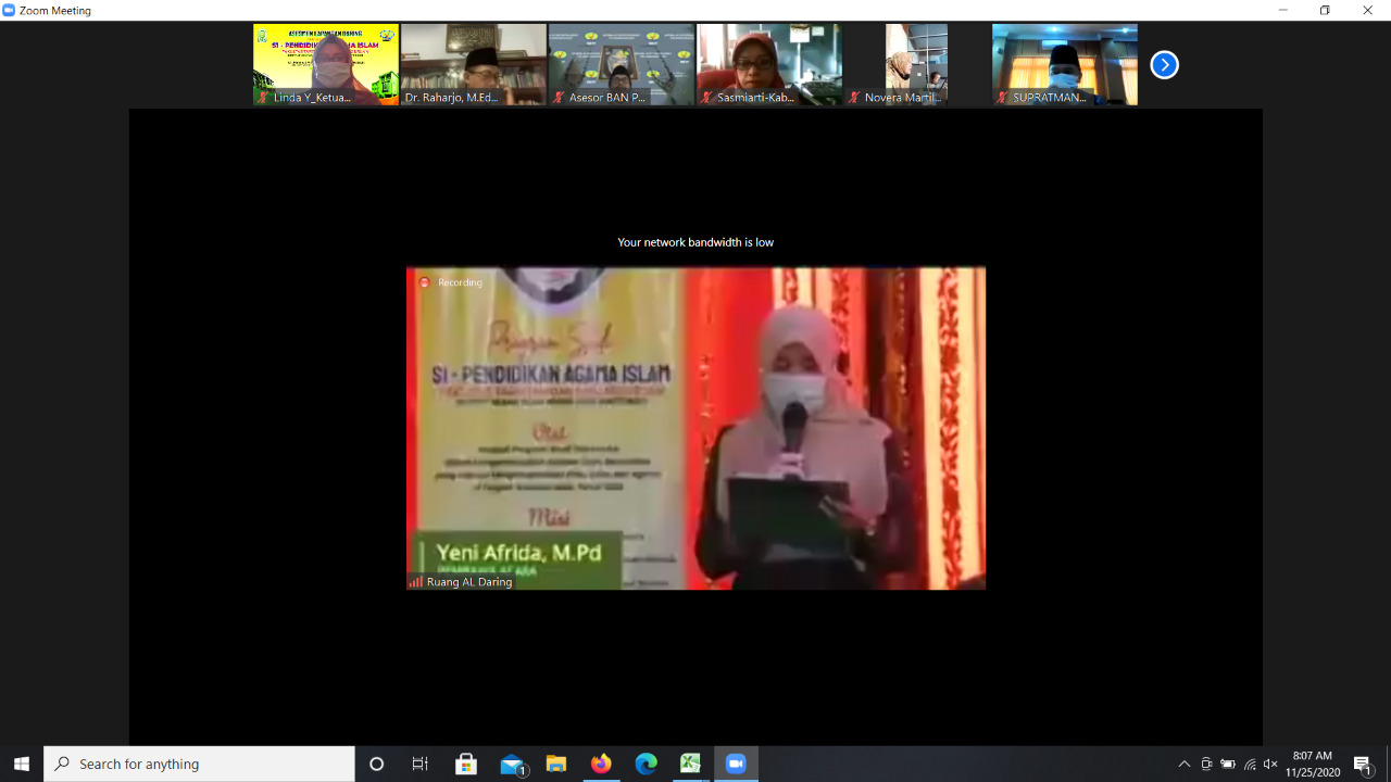 Bukittinggi, Rabu  25 November 2020 telah dilaksanakan acara Pembukaan kegiatan Asesmen Lapangan (AL) daring Program Studi S1 Pendidikan Agama Islam (S1 PAI) Fakultas Tarbiyah Dan Ilmu Keguruan IAIN Bukittinggi bertempat di Gedung Madinah Lt. III. Rangkaian kegiatan dalam acara ini diawali dengan pembacaan ayat suci al-qur’an oleh mahasiswa prodi PAI yang juga merupakan qori’ah tingkat propinsi (Dani Rahman), dilanjutkan dengan pembacaan do’a oleh salah satu dosen Fakultas Tarbiyah dan Ilmu Keguruan (FTIK) Firdaus Anas., S.Pd., M.Kom., sambutan dan pembukaan kegiatan AL daring secara resmi oleh Rektor IAIN Bukittinggi (Dr. Ridha Ahida, M.Hum), sambutan dan arahan dari asesor prodi PAI (Dr. Mahmud Arif., M.Ag dan Dr. Rahardjo, M.Ed, St).  Acara ini   diikuti oleh seluruh unsur Pimpinan IAIN Bukittinggi secara virtual zoom (para Wakil Rektor, Dekan, para Wakil Dekan, Direktur Pascasarjana, Ketua Senat, Ketua Lembaga, Kepala Unit, ketua prodi, Kabag dan Kasubag, serta seluruh tim akreditasi prodi PAI), alumni S1 PAI FTIK yang telah sukses dalam beberapa Jabatan dan Frofesi, beberapa orang perwakilan Mahasiswa Prodi S1 PAI Aktif pada setiap jenjang semester, para User diberbagai sektor baik Lembaga Formal maupun Informal dan Tenaga Kependidikan. Asesmen Lapangan Daring Prodi S1 PAI ini merupakan Al daring kedua yang diikuti oleh IAIN Bukittinggi yang akan berlangsung selama dua hari (Rabu-kamis tanggal 25-26 November 2020). Adapun yang bertindak sebagai Assesor dalam AL daring ini terdiri dari 2 (dua) orang Assesor dari BAN-PT yaitu Bapak Dr. Mahmud Arif, M.Ag (UIN Sunan Kalijaga Yogyakarta) dan Bapak Dr. Raharjo, M.Ed.St (UIN Walisongo Semarang). Tim LPM
