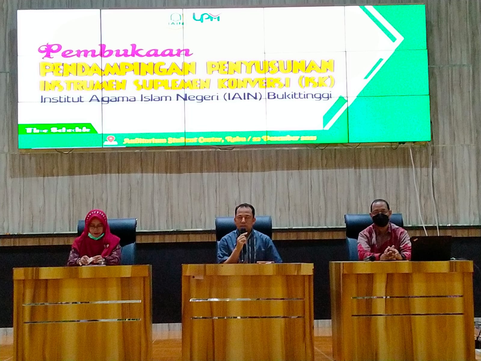 Kegiatan Pembukaan Pendampingan Penyusunan ISK dibuka resmi oleh Wakil Rektor  Bidang Akademik dan Pengembangan Lembaga  (Dr. H. Asyari., S.Ag., M.Si) bertempat di Student Center IAIN  Bukitinggi. Hadir dalam acara pembukaan Wakil Rektor 1,  Ketua LPM, Sekretaris LPM, Kepala-kepala Pusat, Pranata Komputer Ahli Muda LPM dan seluruh staf LPM, seluruh Dekan dan Wakil Dekan Selingkup IAIN Bukittinggi, Direktur Pascasarjana, Ketua-ketua Prodi  dan Gugus Kendali Mutu Fakultas  dan Prodi Selingkup IAIN Bukittinggi.